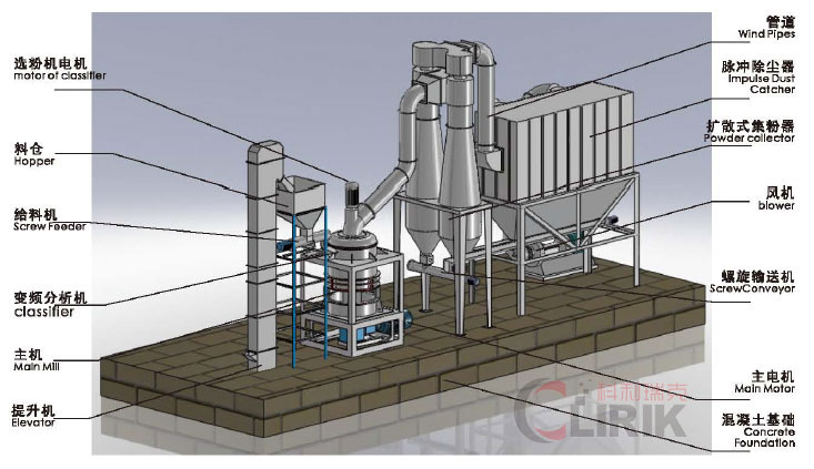 HGM超細磨粉機生產線包括破碎機、斗式提升機、儲料倉、振動給料機、超細磨粉機主機、變頻分級機、集粉器、脈沖除塵器、高壓風機、空氣壓縮機、電氣控制系統。